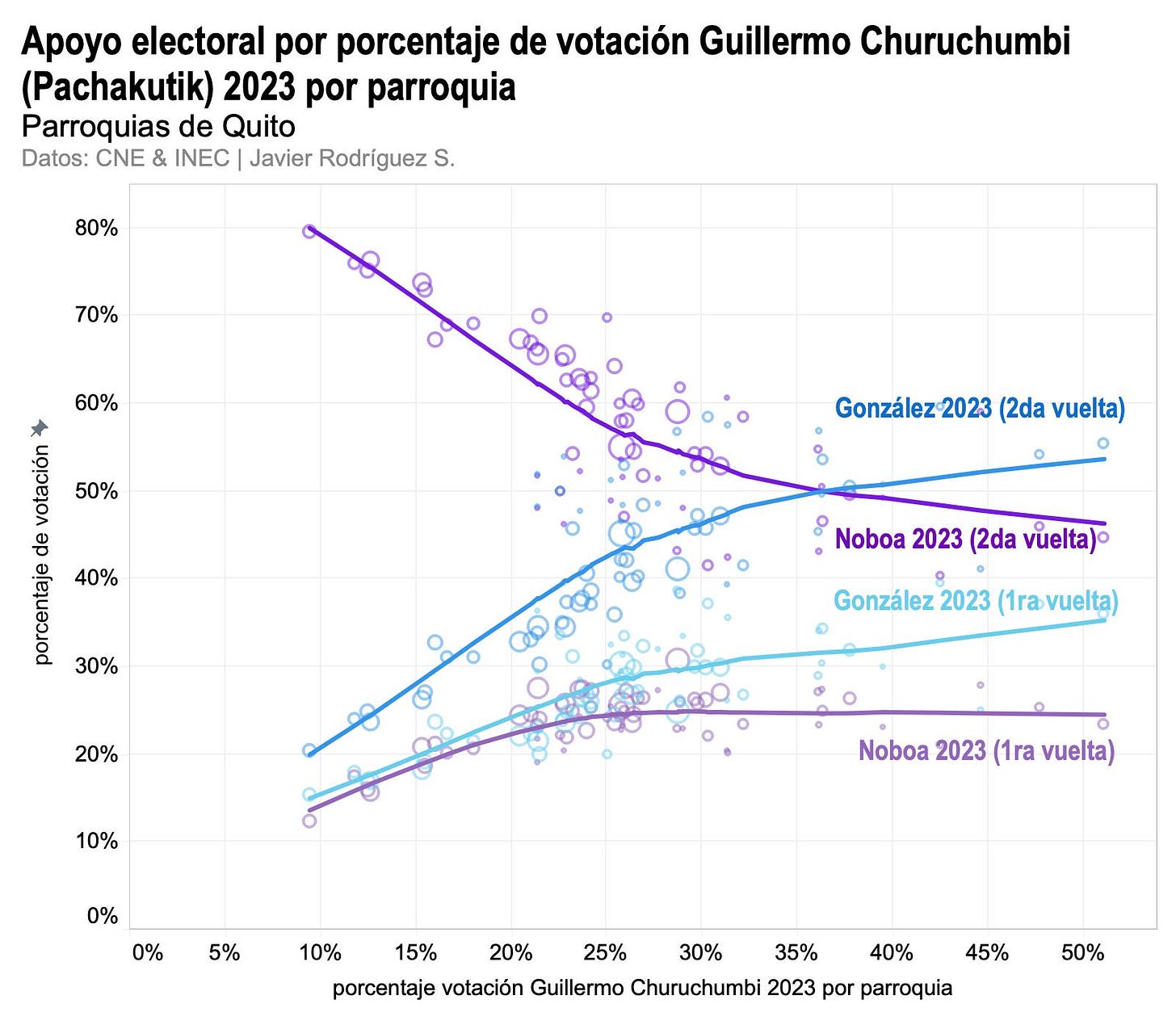 Cómo leer la figura: el eje horizontal muestra el porcentaje de votación de Guillermo Churuchumbi en las elecciones seccionales de 2023. Cada círculo representa a una de las parroquias de Quito. El tamaño de los círculos representa el número de electores por parroquia. En el eje vertical se muestra el porcentaje de apoyo recibido por cada uno de los dos candidatos. Las líneas de tendencia facilitan la lectura porque son un resumen de la dirección de la tendencia general para cada candidato en la primera y segunda vuelta de 2023.