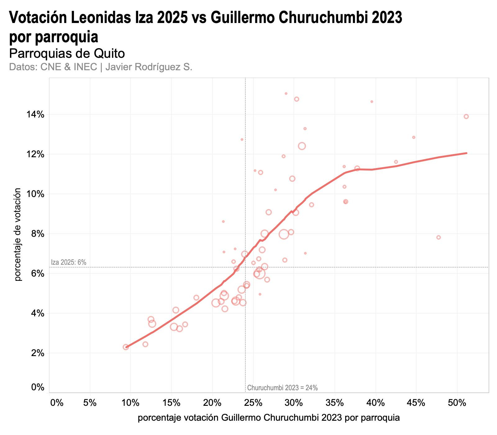 Por las razones que sean —y las razones son importantes pero no son el objetivo de este artículo— donde le fue bien a Churuchumbi en 2023 le fue bien a Iza en 2025. Existe una fuerte correlación estadística entre ambas votaciones. Subrayamos que lo que interesa aquí es la tendencia en la votación de ambos candidatos a nivel de las parroquias y no el nivel de la votación en sí mismo. El nivel no tiene punto de comparación: Churuchumbi sacó 24% en Quito, Iza sacó 6%.