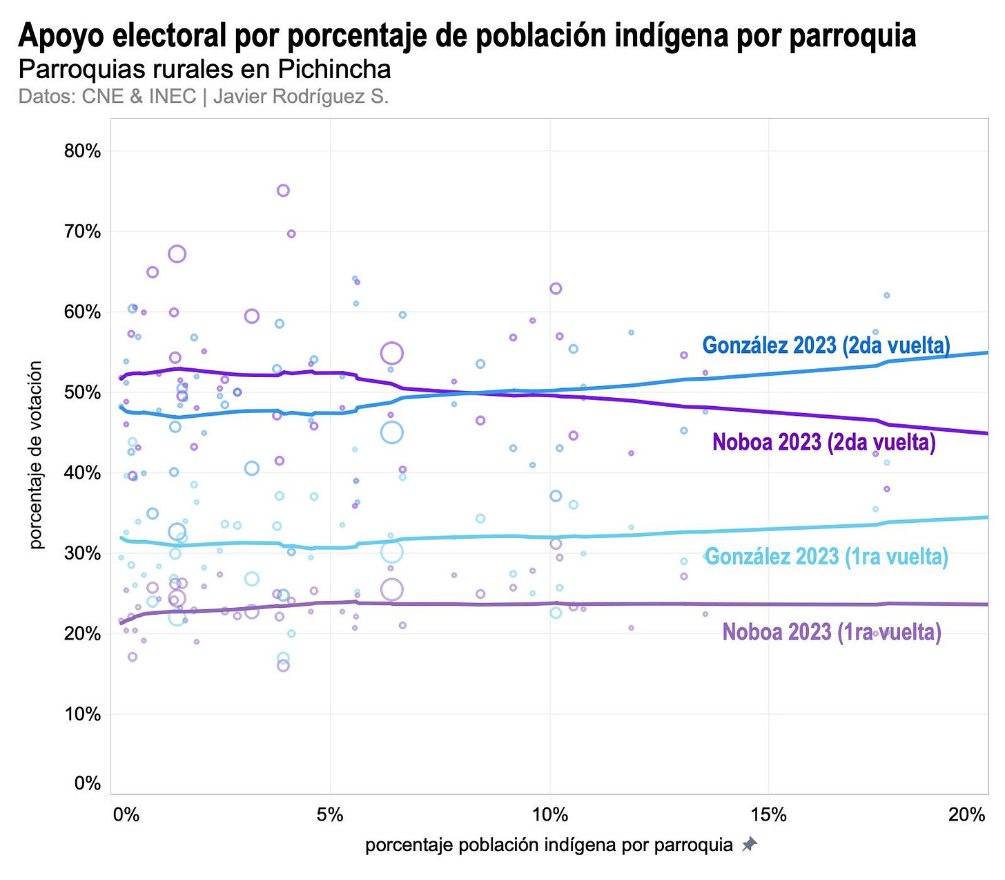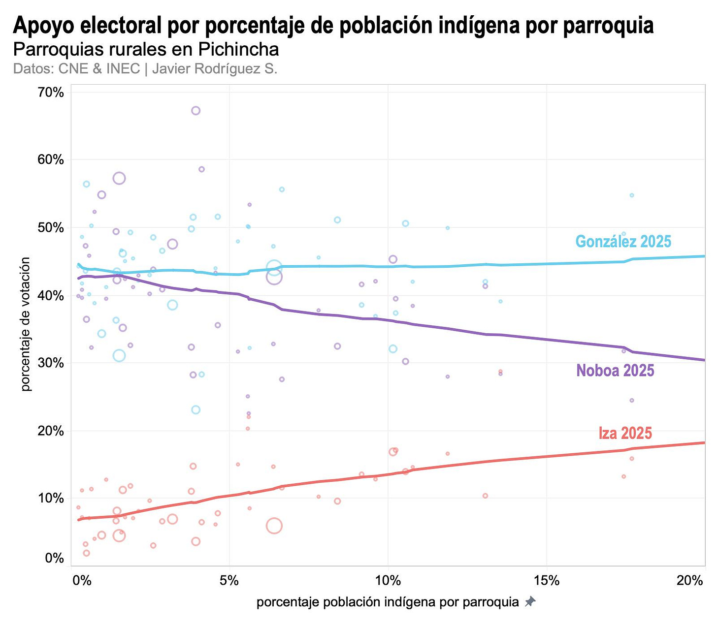 Cómo leer la figura: el eje horizontal muestra el porcentaje de población indígena en cada una de las parroquias rurales de Pichincha. Cada círculo representa a una parroquia. El tamaño de los círculos representa el número de electores por parroquia. En el eje vertical se muestra el porcentaje de apoyo recibido por cada uno de los tres candidatos. Las líneas de tendencia facilitan la lectura porque son un resumen de la dirección de la tendencia general para cada candidato (por ejemplo, en el caso de Iza, a mayor porcentaje de población indígena por parroquia, mayor es el porcentaje de votación recibido).