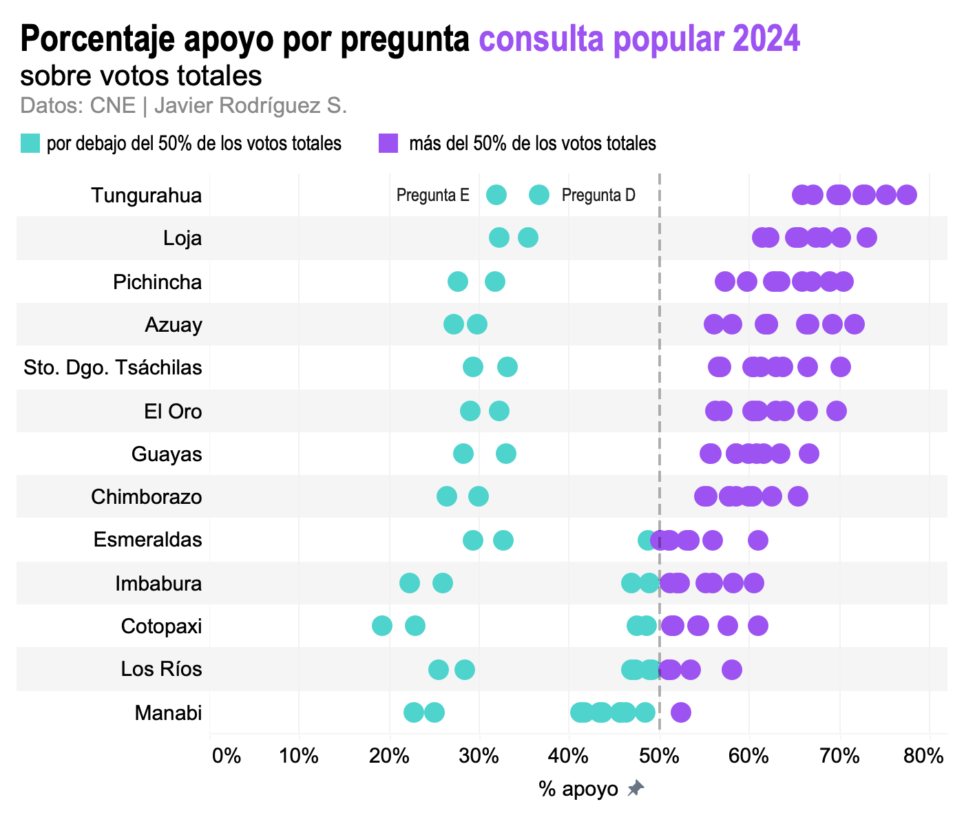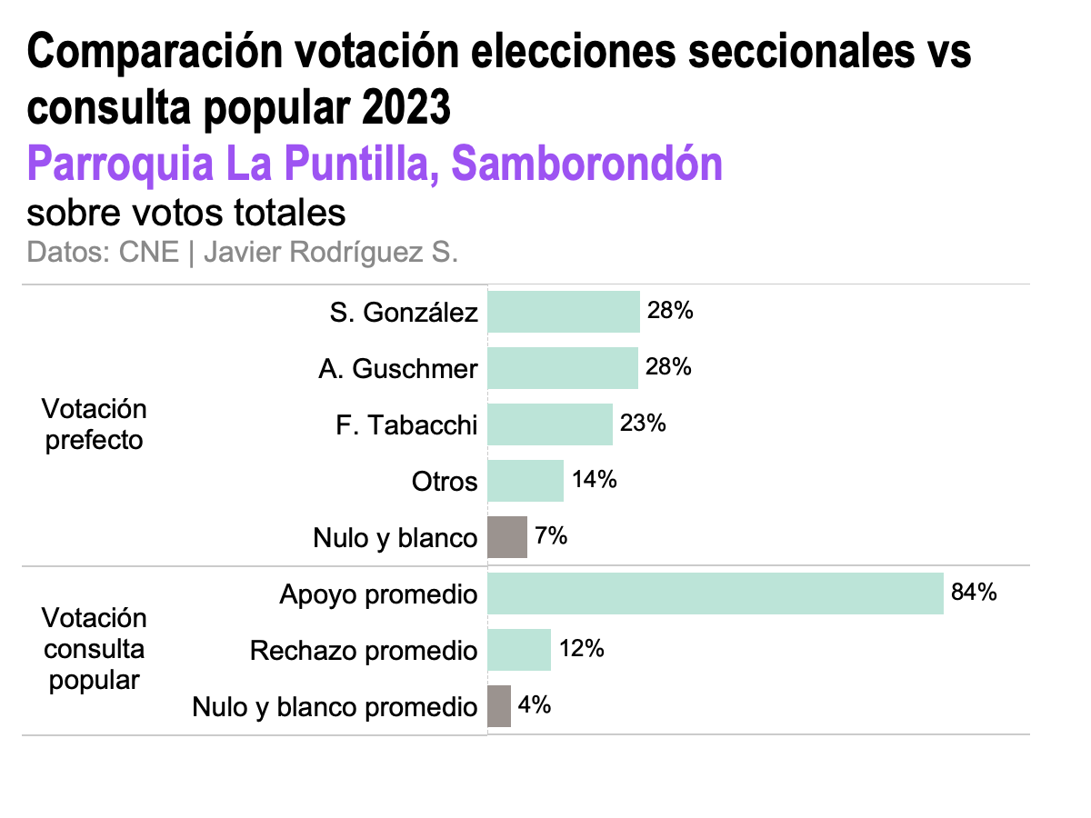 En la Puntilla, por ejemplo, en la elección para prefecto, tres candidatos de derecha (Susana González, Andrés Guschmer y Francesco Tabacchi) recibieron casi el 80% de la votación. Tabacchi, de CREO, notablemente recibió un apoyo electoral muy por encima del que recibió en la provincia en su conjunto —alrededor del cinco por ciento. Las preguntas de la consulta recibieron, en promedio, un apoyo de 84%. No hay gran diferencia entre el nulo en la votación para prefecto y el nulo en la votación para la consulta. En resumen, la Puntilla es un ejemplo de un territorio de clara orientación de derecha —léase, favorable al gobierno de Lasso— que apoyó la consulta popular en proporción similar.