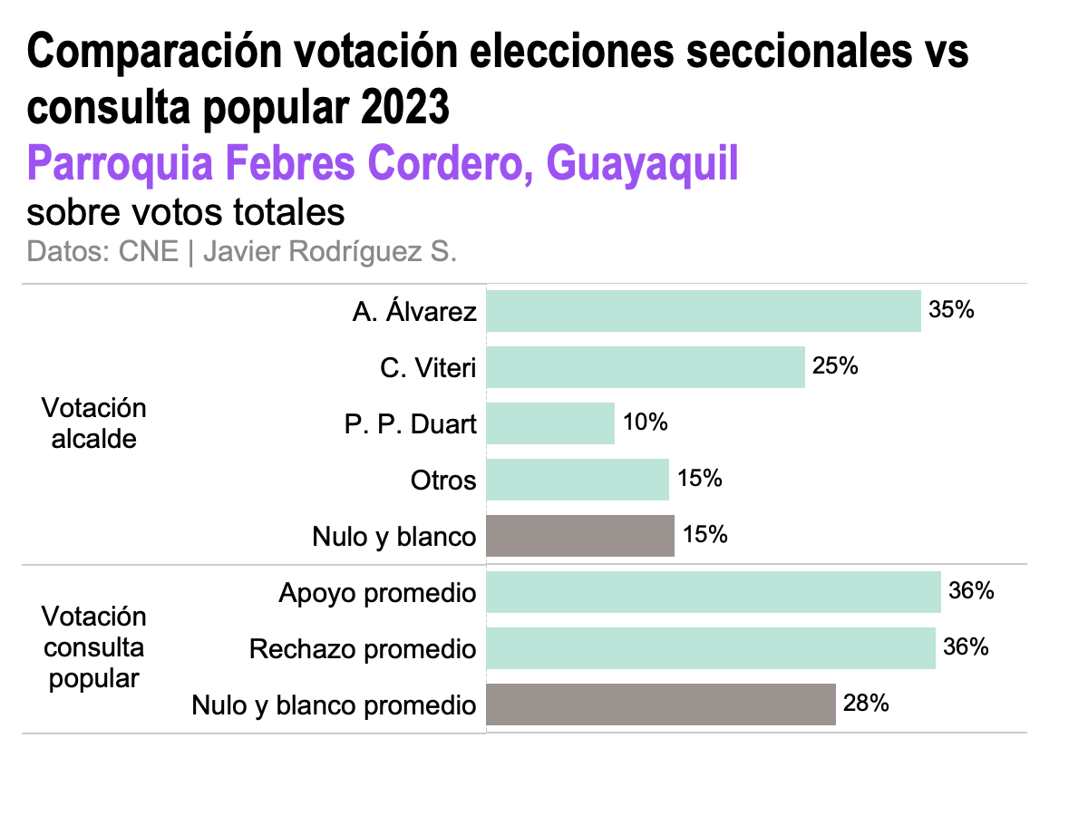 En Febres Cordero, en la elección para alcalde, la votación se distribuyó de manera parecida a la ciudad en su conjunto. Aquiles Álvarez de la Revolución Ciudadana ganó con 35%, seguido de dos opciones de la derecha del espectro que combinadas sumaban alrededor de 35% puntos. El apoyo y el rechazo a las preguntas de la consulta popular empataron más o menos en números similares, 36-36. El nulo y blanco en la contienda para la alcaldía fue del 15%. En la consulta popular fue casi el doble —28%, en promedio entre preguntas. ¿De dónde vinieron esos votos nulos adicionales en la votación de la consulta popular?