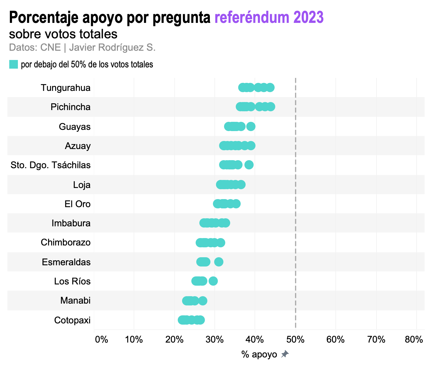 La evidencia empírica que viene de los resultados electorales mismos es bastante limitada en este caso. La consulta popular de Lasso de febrero del 2023 se realizó simultáneamente con las elecciones seccionales. Es decir, los mismos electores votaron el mismo día en diferentes papeletas, unas para autoridades locales (cantonales, provinciales), y otra para las preguntas de la consulta popular.