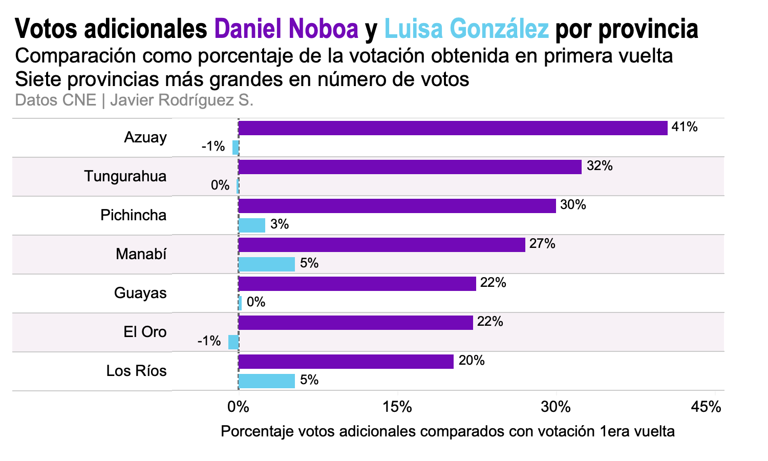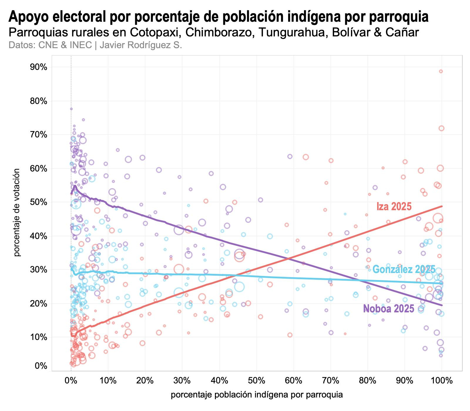 Entre primera y segunda vuelta, la votación de Noboa creció en todas las parroquias, pero especialmente creció más en las parroquias que habían apoyado más fuertemente a Iza en la primera vuelta. Es decir, la mayoría de votantes que apoyaron a Leonidas Iza en las parroquias de mayor población indígena y campesina se volcaron hacia Daniel Noboa en la segunda vuelta. Luisa González creció considerablemente menos en esas parroquias.