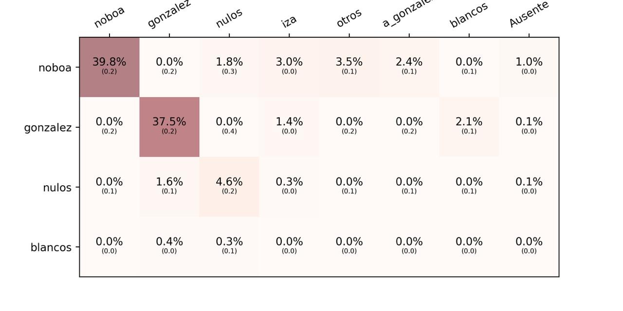 Cómo leer la tabla es importante. En primera vuelta, Noboa y González empataron 44-44% en porcentaje sobre votos válidos. Los votos blancos y nulos no son parte de los votos válidos. Para este análisis usamos los votos totales (incluyendo blancos y nulos) porque alguien que votó por un candidato en primera vuelta puede votar nulo en segunda, y viceversa. Sobre votos totales, Noboa y González empataron 40-40% (redondeando, para facilitar la lectura). La celda superior izquierda (39.8%) indica que del total de votos que fueron a Noboa en primera vuelta (ese casi 40%, redondeando) prácticamente la totalidad —ese coeficiente de 39.8— fueron a Noboa en la segunda vuelta. Otra forma de expresar lo mismo sería decir que de todos los votos que fueron a Noboa en primera vuelta, prácticamente la totalidad —prácticamente el 100%— fueron a Noboa en la segunda vuelta.