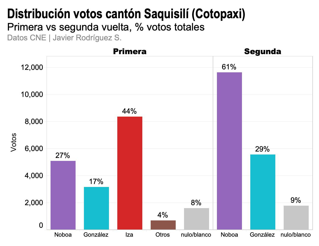 El caso de Saquisilí, en la provincia de Cotopaxi, es ilustrativo. Saquisilí fue el cantón de mejor desempeño del candidato indígena en la primera vuelta, y Cotopaxi es al mismo tiempo un bastión del movimiento indígena ecuatoriano y el lugar donde nació y creció Iza. En la primera vuelta, Iza recibió el apoyo del 44% de los votantes en ese cantón. Noboa alcanzó ahí apenas el 27% y González el 17%. Pero en la segunda vuelta, el electorado del cantón se volcó abrumadoramente por Noboa, quien alcanzó el 61%, mientras que González logró el 29%, sumando apenas 12 puntos por encima de su votación de primera vuelta.