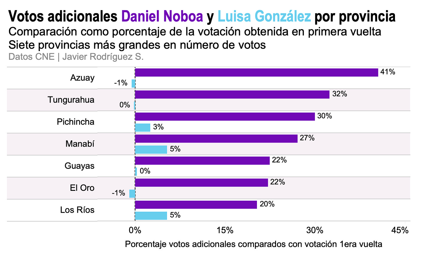 Cómo leer la figura: exactamente igual que la figura anterior, pero ahora agregamos la votación de Noboa y González en la segunda vuelta electoral. La distancia entre ambas líneas, la de primera y segunda vuelta para cada candidato respectivamente, muestra el crecimiento de su votación.