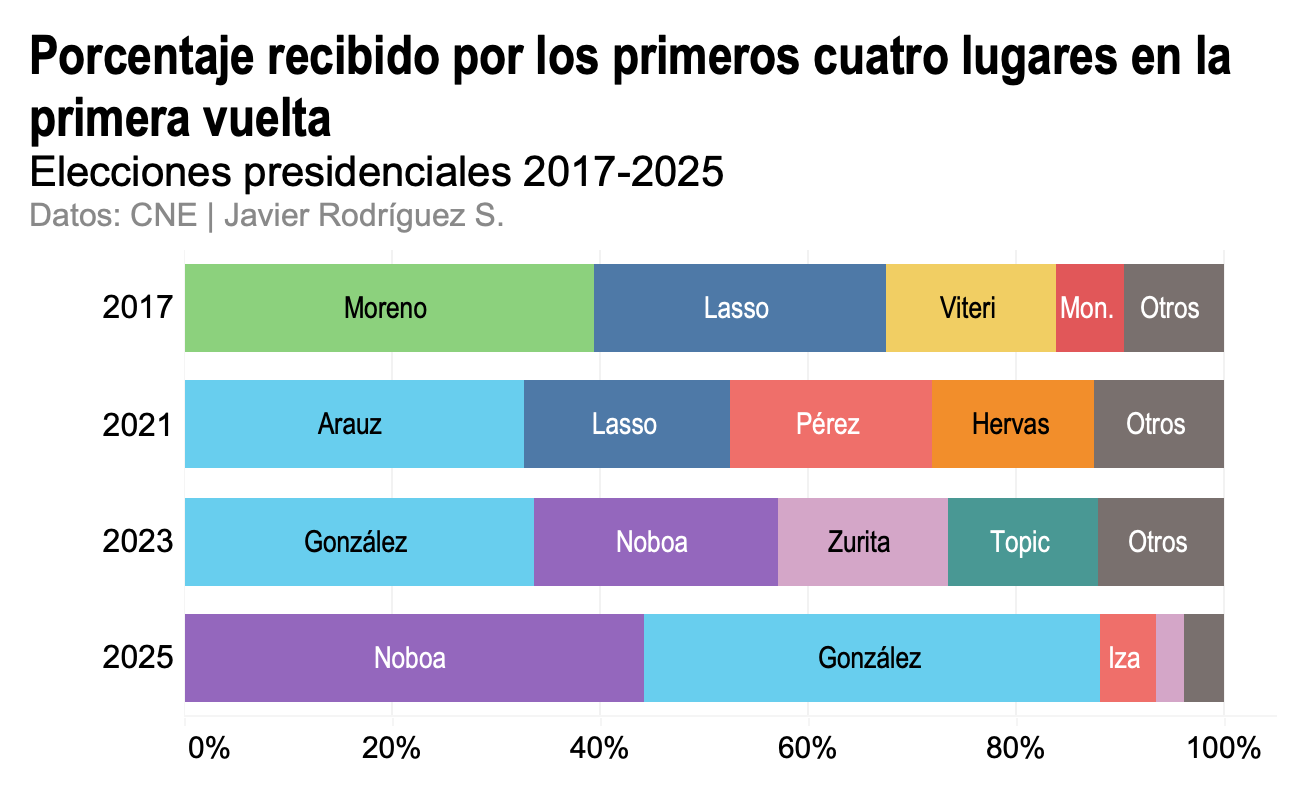 Era como si al haber transcurrido tan poco tiempo entre las elecciones, el electorado no hubiera otorgado espacio para considerar otras alternativas y hubiera votado en la primera vuelta de 2025 con las mismas preferencias que lo hizo en la segunda vuelta de 2023. Por otro lado, el contexto de criminalidad, crisis económica y crisis energética sirvieron como factores que concentraron la atención sobre dos actores principales: el gobierno de Noboa, encargado de gestionar las crisis, y su antagonista principal, el correísmo. Los electores se enfrentaron a una papeleta con varios nombres, pero votaron efectivamente entre sólo dos opciones.