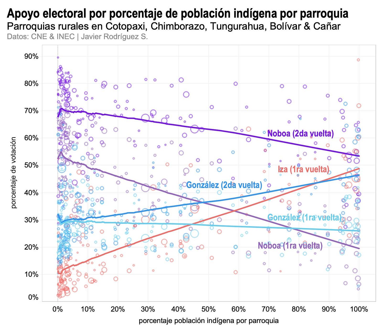 Iza tuvo su mejor desempeño en la primera vuelta en las parroquias de mayor población rural y campesina en detrimento de Noboa, quien se desempeñó mejor en las parroquias urbanas y de baja o nula población indígena. La votación de González en la Sierra centro fue bastante uniforme, bordeando el 30% de los votos, independientemente de la composición étnica de las parroquias.