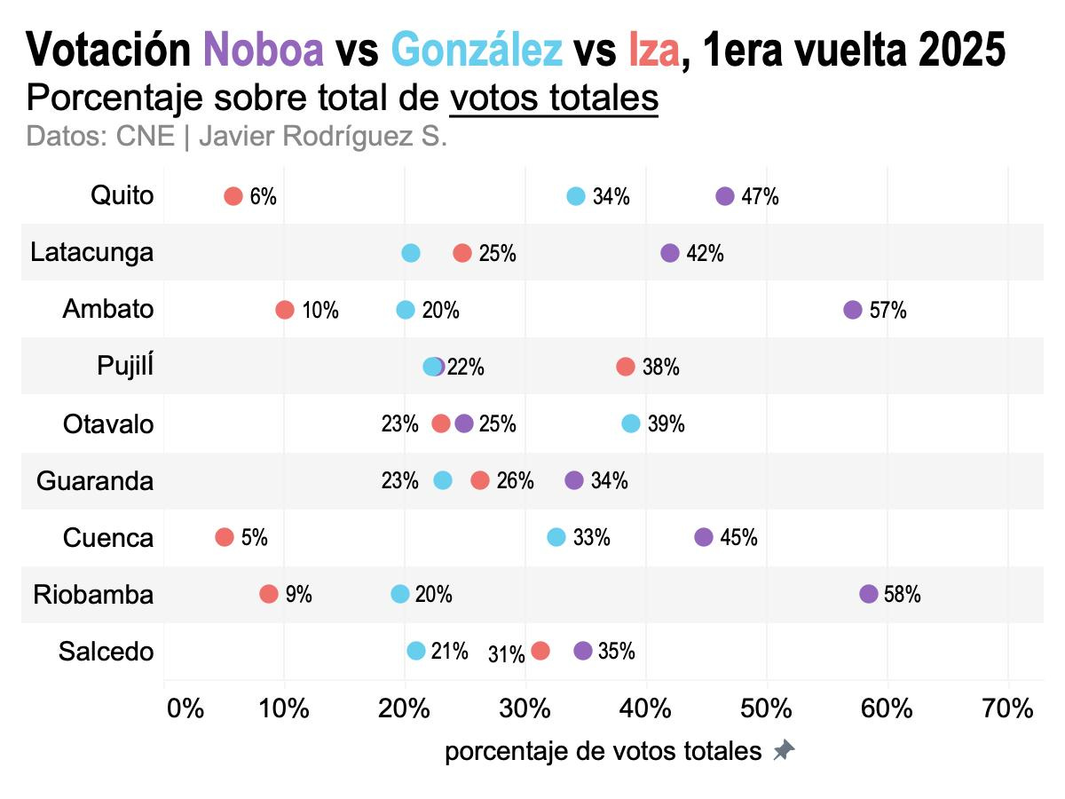 En Quito, González obtuvo prácticamente la misma votación en 2023 y 2025. Noboa retrocedió 10 puntos, de 57% a 47%. Iza, en 2025, obtuvo 6%. En Ambato, la RC tuvo prácticamente la misma votación (23% vs 20%), Noboa retrocedió 12 puntos (de 69% a 57%), y Leonidas Iza sacó 10%. En Cuenca, la RC sacó la misma votación (34% vs 33%), Noboa retrocedió 12 puntos (de 57% a 45%), Iza sacó 5%.