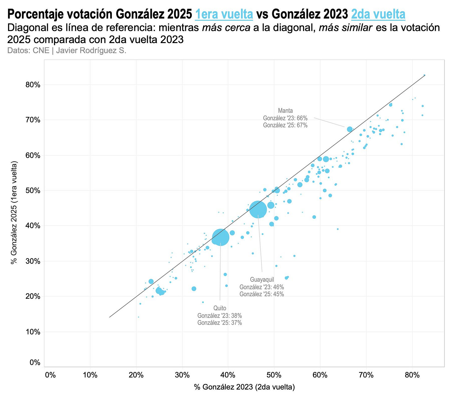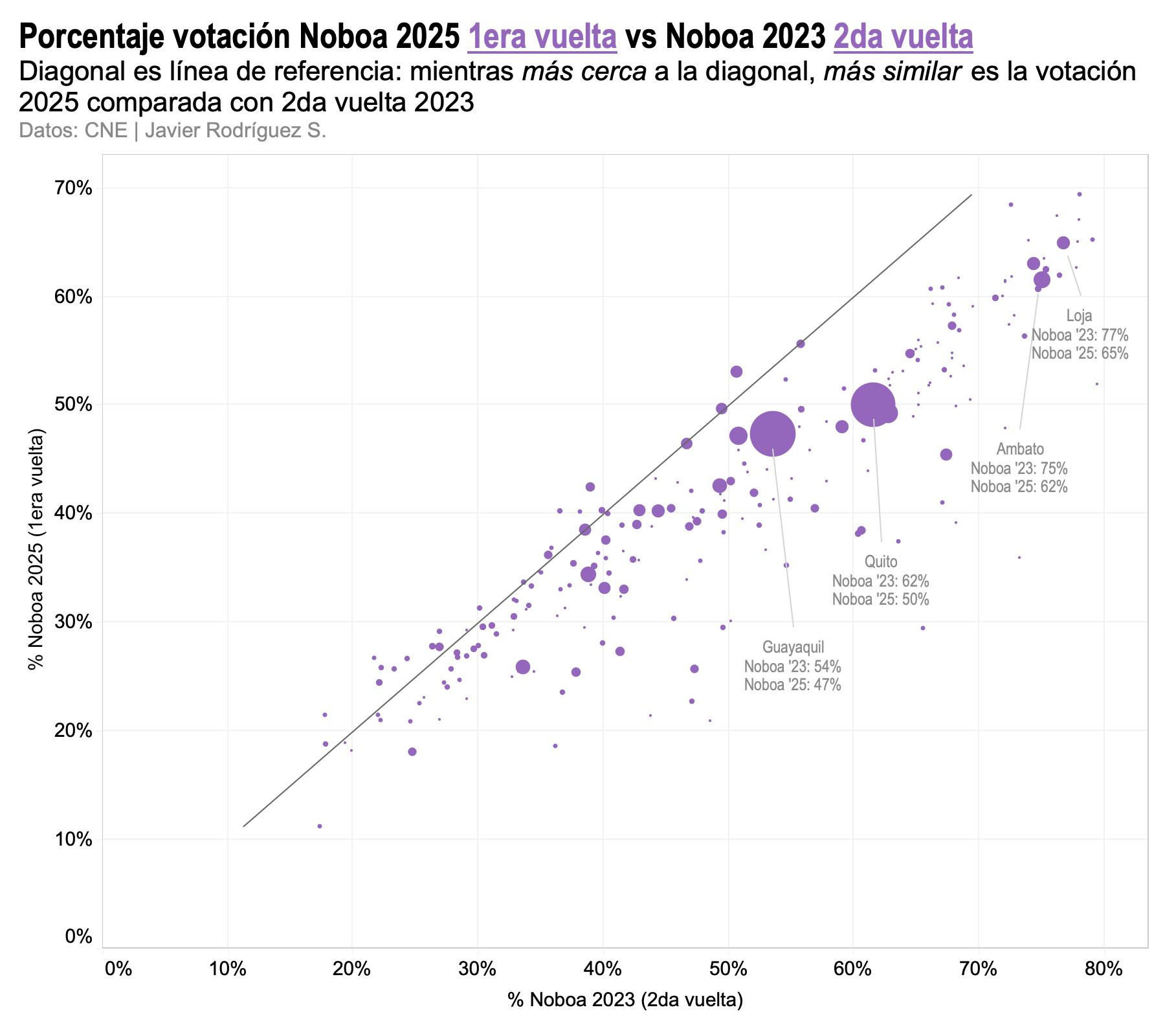 (Cómo leer la figura. El eje horizontal muestra la votación de Noboa en 2da vuelta de 2023, el eje vertical muestra su votación en la 1era vuelta de 2025. Mientras más hacia arriba o hacia la derecha, mejor es su votación en ambas elecciones. Cada círculo es uno de los 221 cantones del Ecuador. El tamaño de los círculos representa el número de electores: las ciudades más grandes son los círculos más grandes. La línea diagonal es un punto de referencia. Mientras más cerca está un cantón de la diagonal, más parecida es la votación de 2025 comparada con la de 2023. Mientras más lejos está por debajo de la diagonal, peor es la votación de 2025 comparada con la de 2023)
