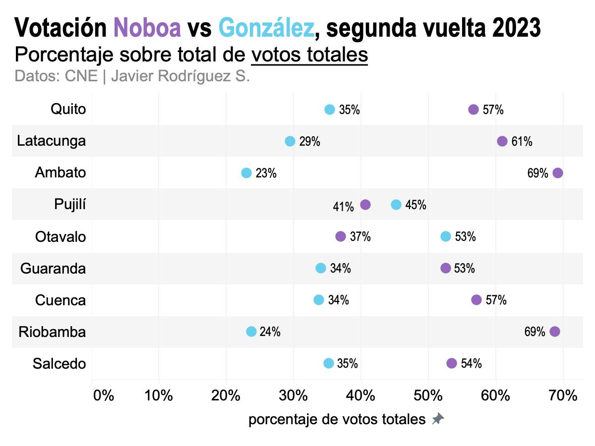Para hablar de las ciudades más grandes, Quito y Guayaquil, juntas, representan más del 30% de los votos del Ecuador. En Quito, en la segunda vuelta de 2023, Noboa recibió 62%. El domingo acaba de recibir 50%. En Guayaquil recibió 54% en 2023 y acaba de recibir 47% en 2025.
